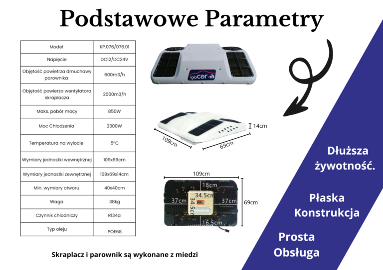 Wysokowydajny elektryczny klimatyzator dachowy 2300W zapewnia przyjemne temperatury i niską wilgotność w kabinach ciężarówek co w połączeniu z lekką konstrukcją i płaskim designem sprawiają, że jest to jeden z najlepszych klimatyzatorów postojowych.
